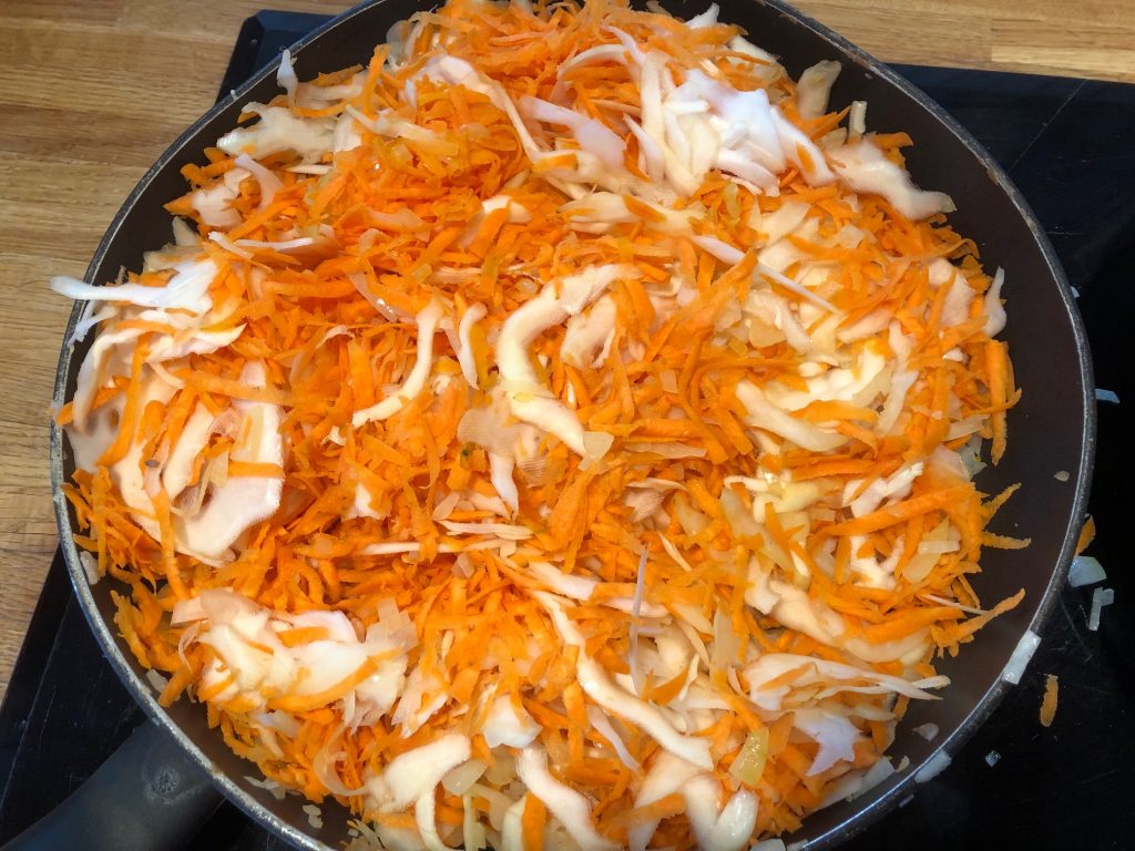 Riv vitkålen, skala och riv morötterna på det grövsta. Hacka löken fint. Bryn löken och lägg sen i morötterna och vitkålen, stek tills de mjuknat. Stek sen nötfärsen på svag värme, krydda med soja, vitlök och chilliflakes. Blanda sen i morots och vitkålsblandningen i nötfärsen. Sätt på ugnen på 200C. Dela filodegsbladen i två delar. Lägg på ca 2 msk av färsröran och rulla ihop arken. Lägg rullarna på en plåt med bakplåtspapper och pensla med uppvispat ägg. Baka mitt i ugnen ca 20 min.