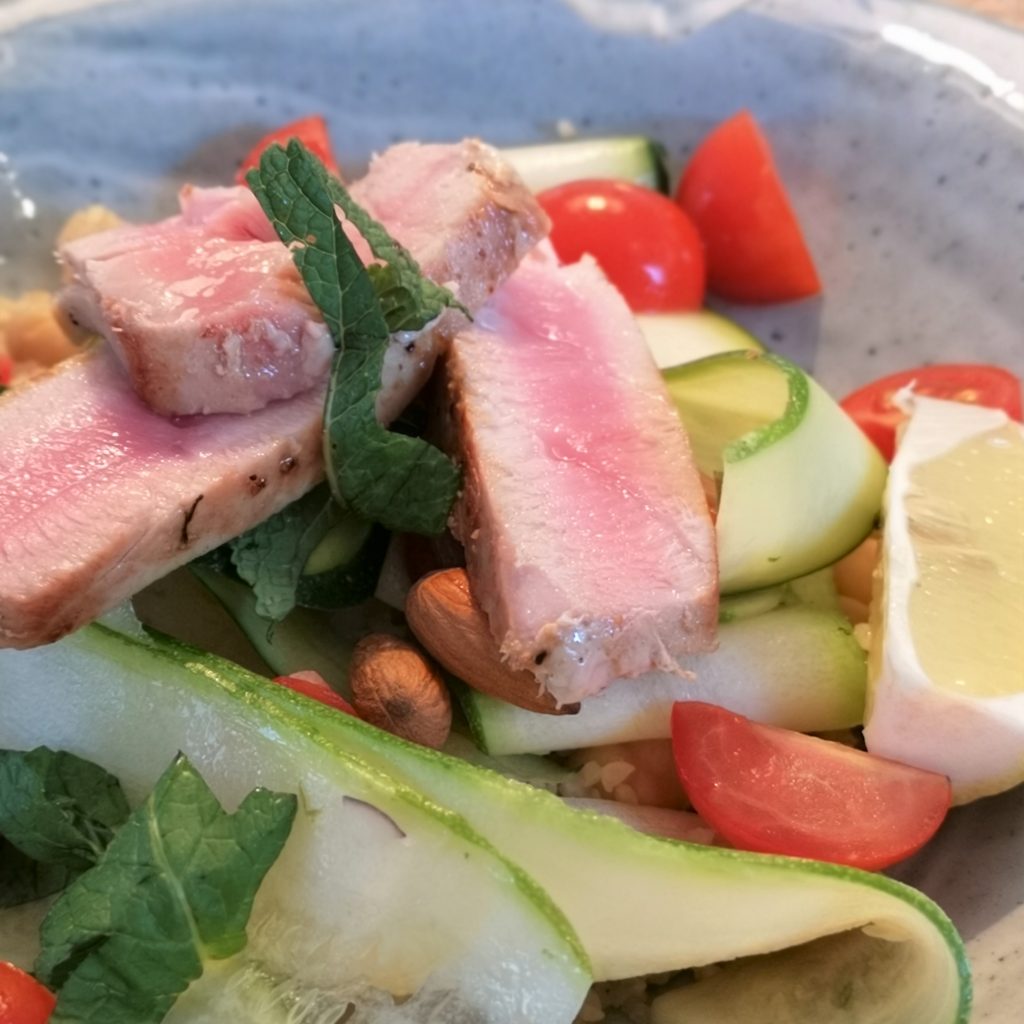 Stek tonfisken i lite smör på medelhög värme så att det får en fin stekyta, va försiktig så den inte blir bränd. Fisken ska få en gråaktig ton runt om men vara rosa i mitten när den är klar. Skiva upp fisken i centimetertjock skivor. Lägg upp quinoan och kikärtsröran i tallrikarna. Toppa med ruccola och prydligt upplagda zucchiniremsorna. Avsluta med mandlar och en skvätt olivolja och lägg tonfisken på toppen.