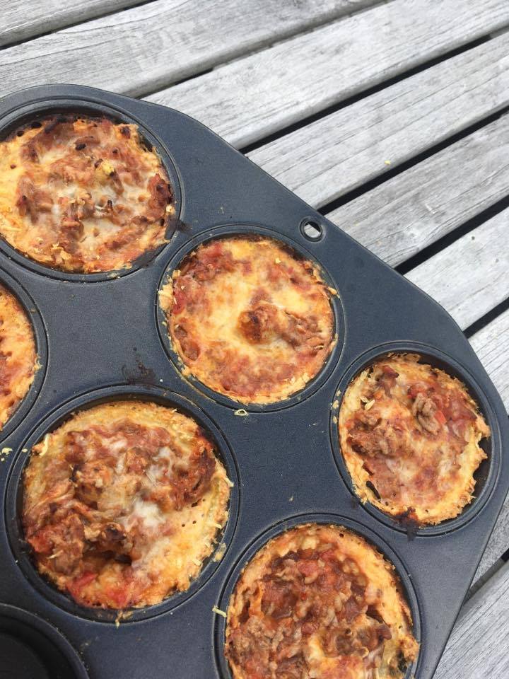 Mal/mixa havregrynen till mjöl (måste inte vara helt malt). Blanda i bakpulver och salt. Tillsätt äggen och keso, blanda. Smörj formarna med lite olja. Tryck ut degen ganska tunn i muffinsformarna. Förgrädda i 225C i 5 min. Lägg sen på nötfärsen och någon matsked äggstanning och strö över med 10% ost. Grädda ytterligare 15 min i 225C.