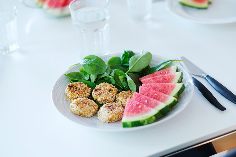 Servera med en stor grön härlig sallad och vattenmelon. Vill du ha en lätt kall sås till så mixa yoghurt, fryst mango, salt, peppar och en skvätt Sambal Olek. Gott med ris eller quinoa till.