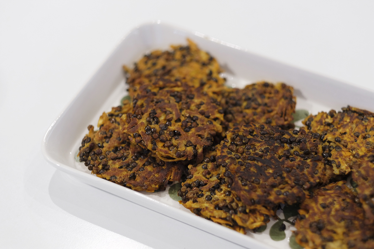 Riv palsternackan och morötterna finrivna. Pressa ur all vätska. Det går fint att enbart använda morötter eller välja en annan rotfrukt. Blanda sen alla ingredienserna i en skål och strö slutligen över pofibret. Forma till biffar med hjälp av en sked och händerna. De är ganska sköra så lägg varsamt ner en biff i taget och tryck till dem i kanterna och platta uppe på biffarna i stekpannan. Stek på medelstark värme till de är gyllenbruna och varma inuti. Vänd försiktigt och stek tills de är klara. De är godast direkt men går fint att spara eller frysa in.