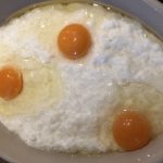 - Tillsätt 3-4 hela ägg och blanda runt.