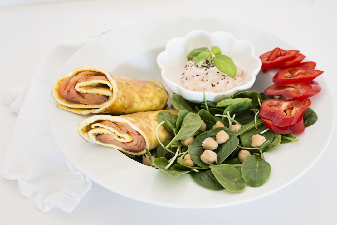 Stek den färska spenaten i lite olja i pannan. Gör äggrullarna (2 st). Vispa ägget med lite salt och peppar. Stek två lövtunna omeletter i en nonstickpanna med 1 tsk olivolja. Stek först stabil på den ena sidan, vänd sedan med ett grytlock och stek stabil på andra sidan. Lägg omeletterna på bakplåtspapper och fördela spenat, lax och dill ovanpå. Rulla ihop tajt och skär rullarna tvärs över. Blanda ihop salladen med kikärtor, bladsallad, rödlök och paprika