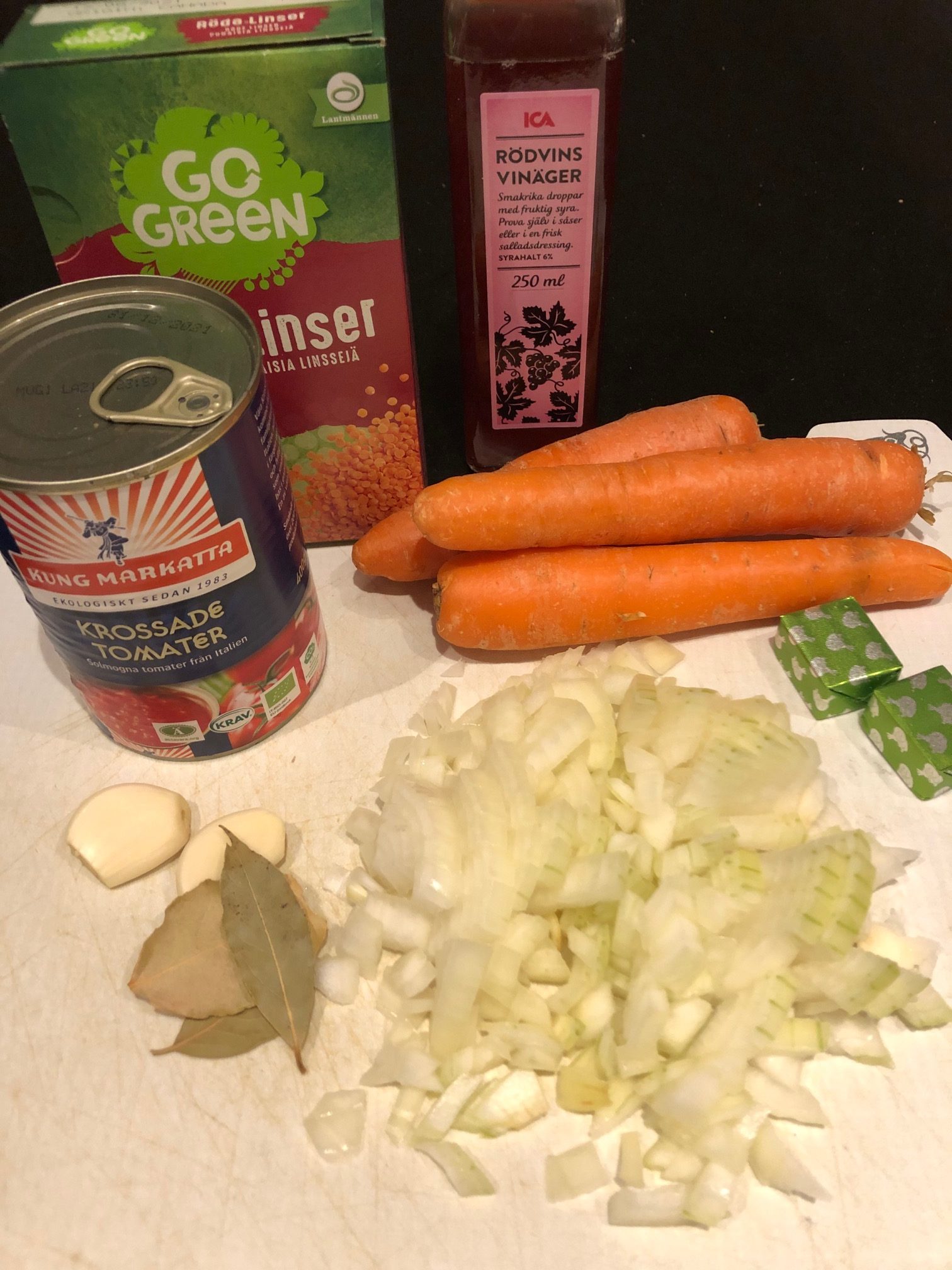 - 2 dl torkade röda linser (som sköljs i vatten)