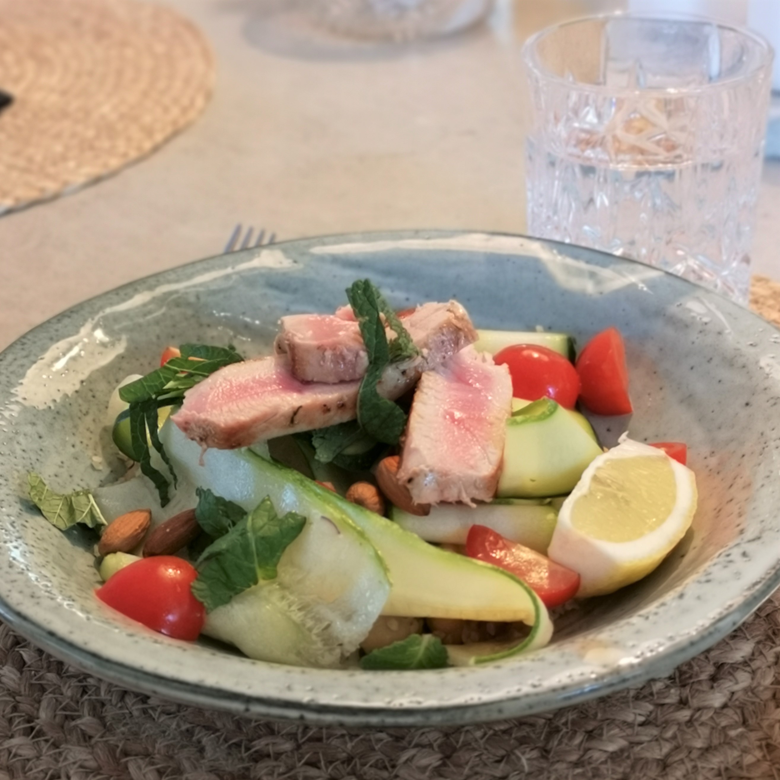 Idag tänkte jag bjuda på en riktigt smarrig rätt som vi lagade till lunch här hemma i veckan. Jag älskar tonfisk och just kombon med massa fräscha grönsaker, mynta och citrus blev verkligen en riktig fullträff i den här rätten. Hoppas ni gillar och blir sugna på att testa själva.