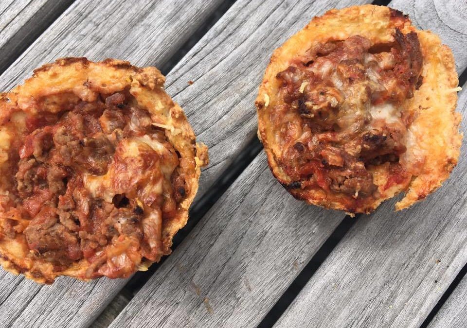 Mal/mixa havregrynen till mjöl (måste inte vara helt malt). Blanda i bakpulver och salt. Tillsätt äggen och keso, blanda. Smörj formarna med lite olja. Tryck ut degen ganska tunn i muffinsformarna. Förgrädda i 225C i 5 min. Lägg sen på nötfärsen och någon matsked äggstanning och strö över med 10% ost. Grädda ytterligare 15 min i 225C.