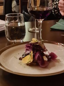Till middag serverades det sen vildsvin med smak av skogen och rostad krossad potatis toppad med