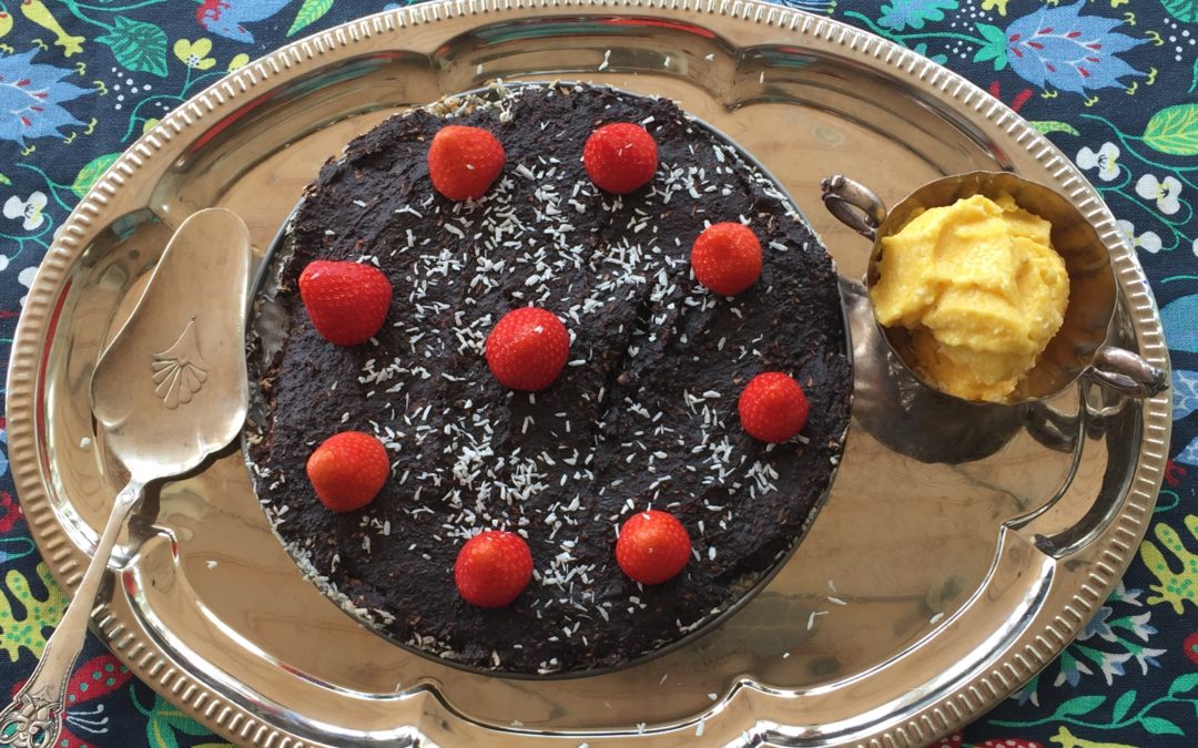 Kör mango och kokos i en mixer till en slät kräm. Sätt in i kylen till servering. Servera chokladkakan tillsammans med jordgubbar tillsammans med kokoskrämen.