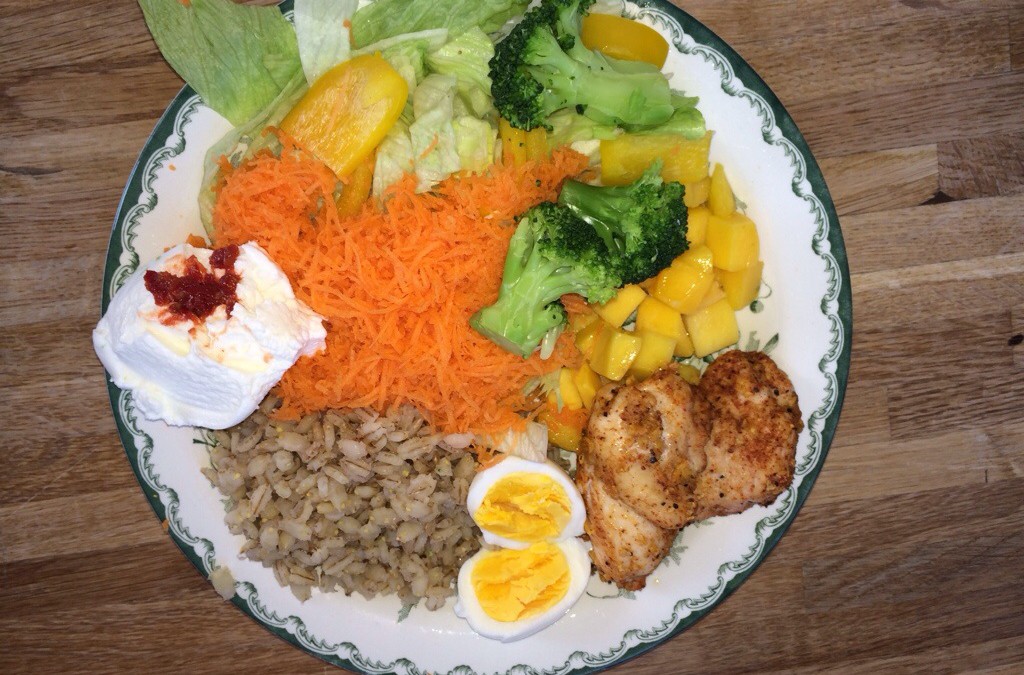 Tallriken nedan består kycklingfilé, kvarngryn, kvargsås med sambal oelek, ägg, broccoli, rivna morötter, mango, isbergsallad ( hade föredragit vitkål men den var slut) och innehåller 480 kcal. Om man gör smarta val kan man äta mycket mat :-).