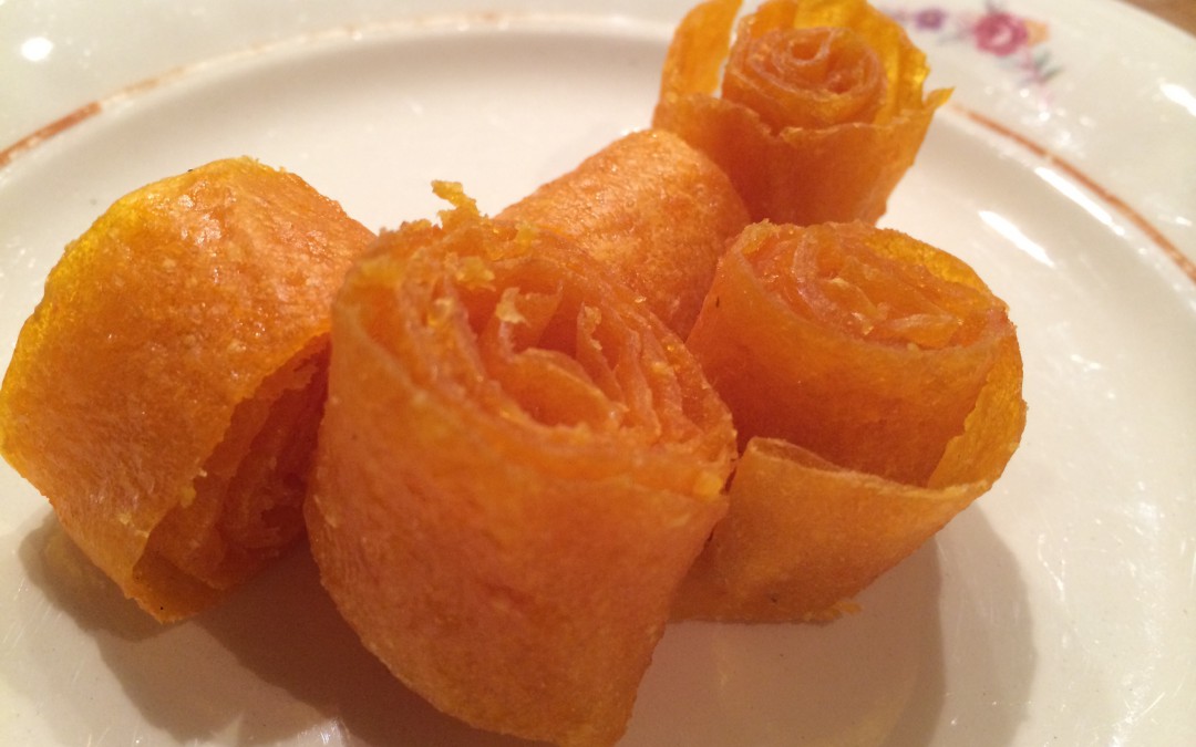Remmarna är klara när purén torkat och går att lyfta ifrån pappret utan att kladda.  Skär eller klipp lagom breda remmar som du sen rullar ihop.