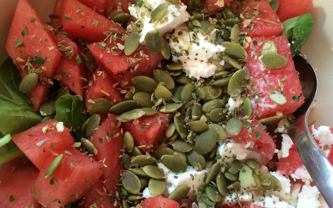 Melonsallad med fetaost, pumpakärnor, bladspenat och örtkryddor är supergott till grillat kött.