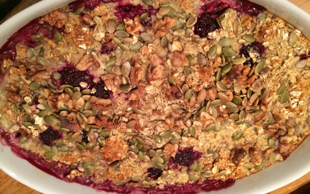 Strö havregrynsblandningen över björnbären i ugnsformen, häll sedan äggblandningen över sist strös nötströsslet över.