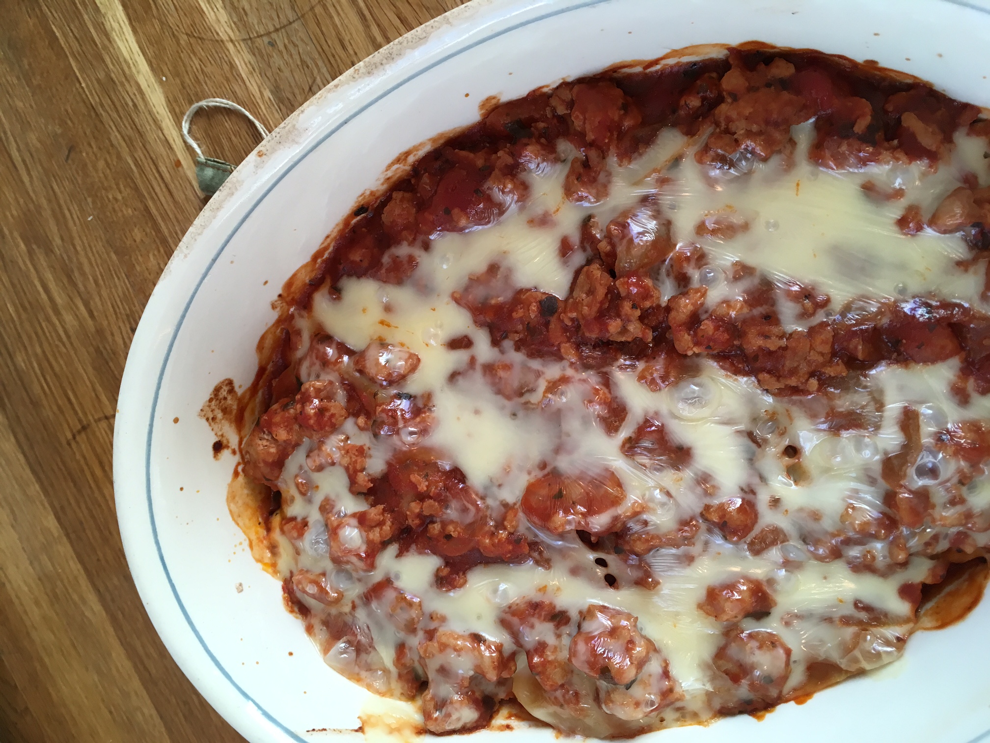 Skala och hacka 1-2 lökar, stek dem i lite smör. Tillsätt 500 g nötfärs. Krydda med kryddor du gillar 😊. Pressa i vitlök om du gillar et. Tillsätt 1-2 paket krossade tomater med basilika.Varva sen sojaplattorna med köttfärsen. Se till att avsluta med köttfärs, riv över ost. Tillaga i 10-15 min i 225 grader eller tills osten fått lite färg.