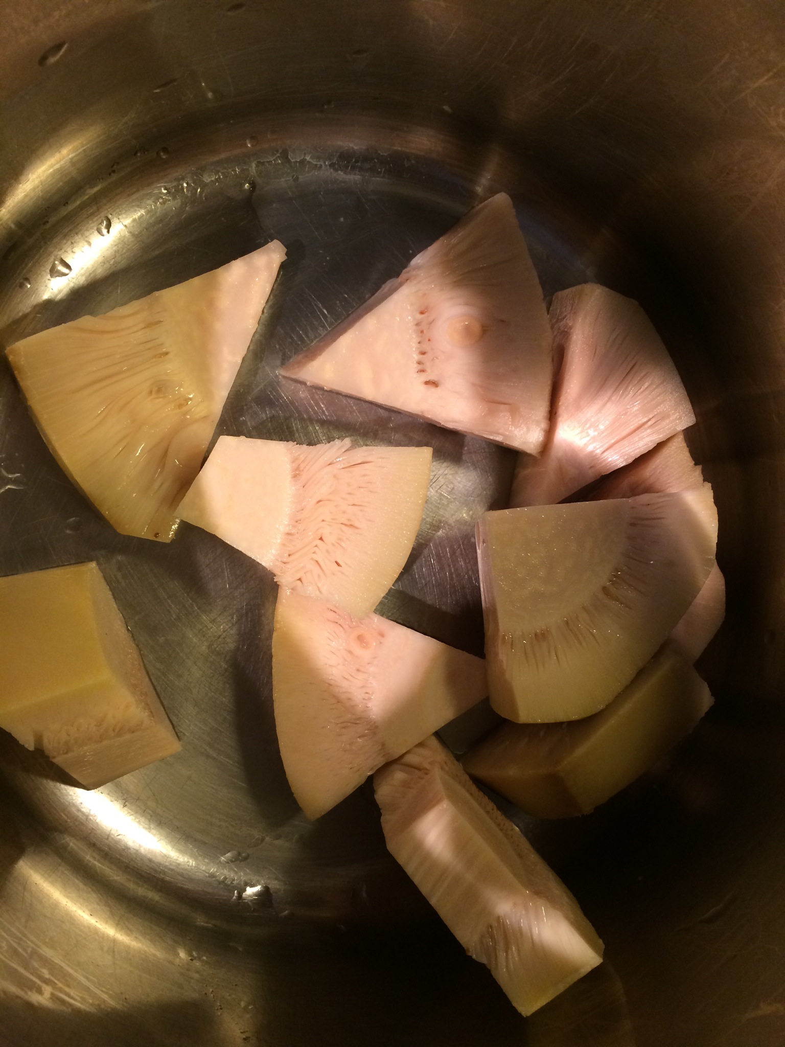 Jack Fruit köps på burk i Asiatiska butiker. Kokas tills den är mjuk och går att dela i småbitar. Serverades tillsammans med bröd, syltad rödlök och grönkålschips.