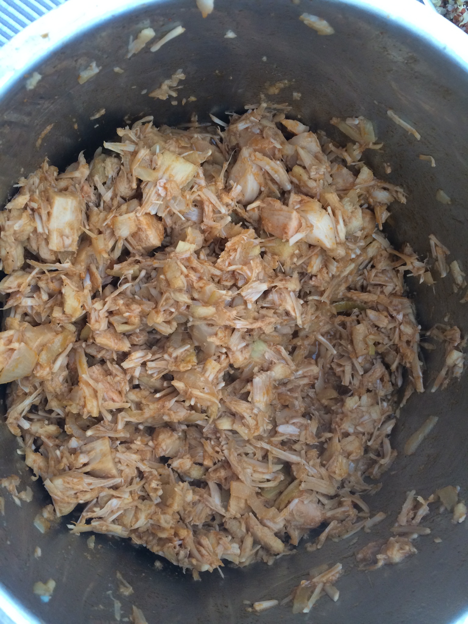 Häll av vattnet av jackfruiten och fräs den i olja i några minuter. Pressa ner 5 vitlöksklyftor och lägg i två skivade gula lökar. Sänk värmen så att inte löken blir stekt utan bara mjuk. Krydda med smokedpaprika krydda, salt, peppar och Chipotle chili, häll på en halv flaska bbq-sås och ett par deciliter öl, låt allt puttra i ca en timme tills jackfruiten har blivit mjuk och går att mosa sönder. Häll i mer Bbq-sås och öl om den blir för torr efter att du mosat allt.