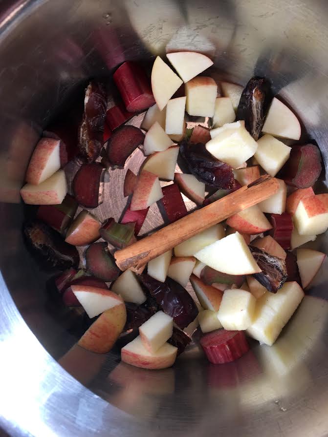 Hacka rabarberna i centimeterstora bitar. Dela äpplet i små bitar. Plocka ur kärnorna i dadlarna. Lägg i rabarber, äpplen och dadlarna i en kastrull, häll på vattnet och lägg i kanelstången. Sjud på låg värme tills äpplena är mjuka. Låt kompotten svalna och häll den sen i en glasburk och använd den till dina mellanmål.