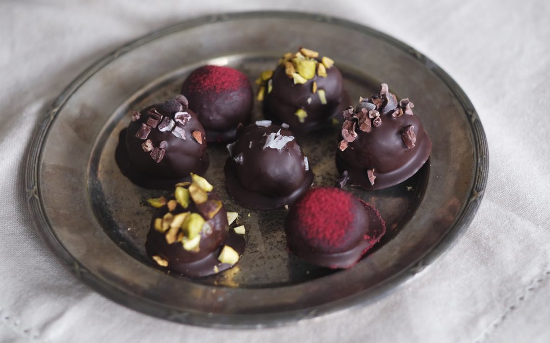 Mixa alla ingredienser till mandelmassan till en slät och fin massa. Forma till bollar och ställ in i kylen. Rör ihop ingredienserna till chokladtäcket och smaka av med vanilj och sött. Det går också bra att smälta mörk choklad. Doppa bollarna i choklad och rulla i valfri topping.