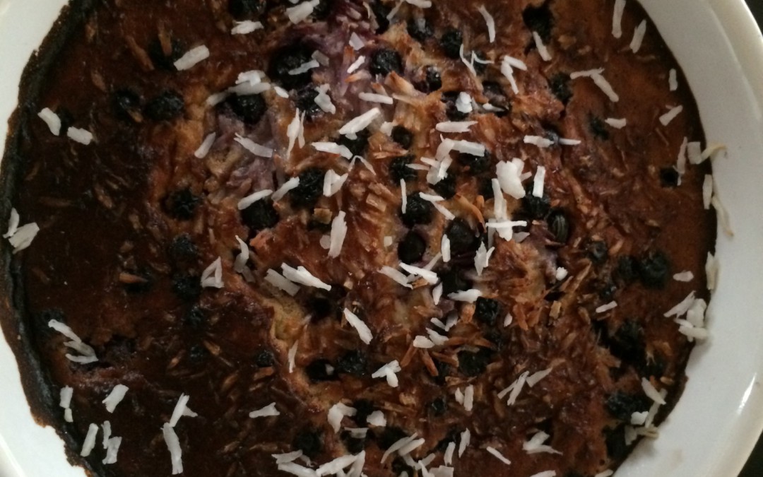Sätt ugnen på 225 grader. Mixa banan, ägg och havregryn med en stavmixer. Smörj en ugnsfast form med kokosolja och häll i banansmeten. Strö över blåbär och kokos. Grädda ca 10-15 minuter tills pannkakan fått färg och känns fast. Jag serverade jordgubbar till idag men man kan även ta keso eller kvarg om man vill eller andra bär.